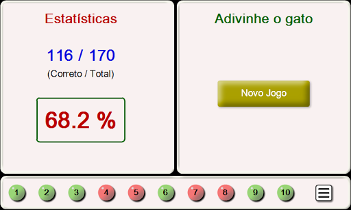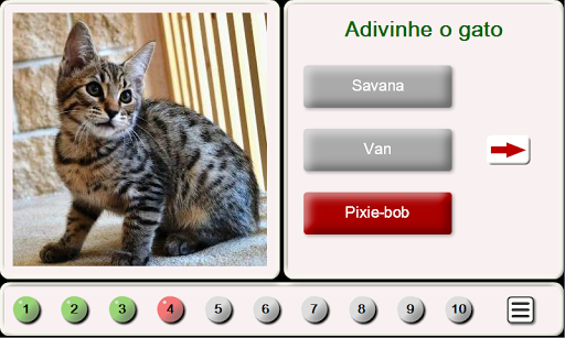 O jogo "Acho que a Raça de Gatos" é um divertido quiz. Das 3 opções que você precisa para escolher uma raça de gato, que está marcado em fotos. As respostas corretas são assinaladas a verde, e erros de vermelho, Para cada resposta correta receberá 1 ponto. Depois que você acertar 10 fotos, você pode ver as estatísticas de desempenho –o número de respostas corretas e o número de fotos, bem como a percentagem de respostas correctas do número total de fotos de gatos.
