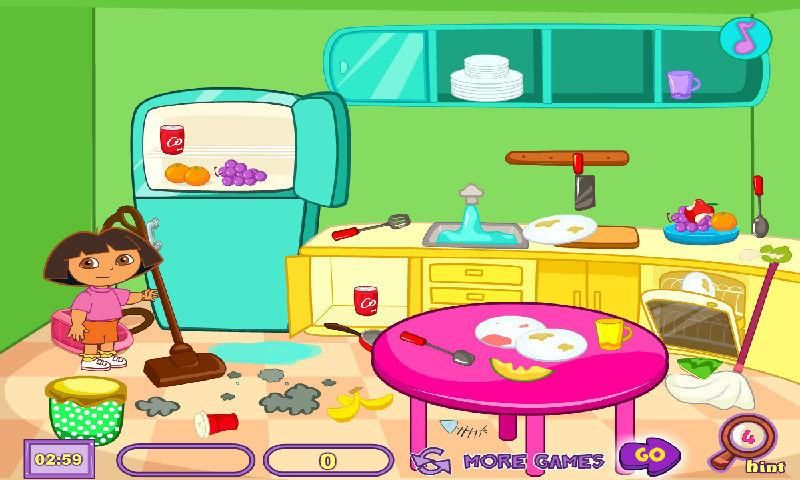 Help Dora to clean her Kitchen and decorate it for the Party. Your job is to put each object in its proper place to make the Kitchen look perfectly. Pay attention to the time! Dora Room Clean is a very fun game!