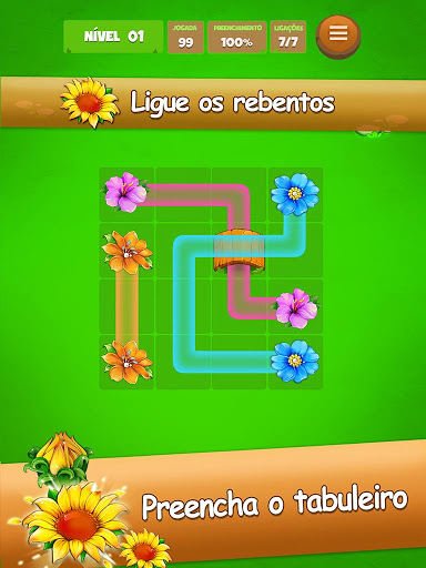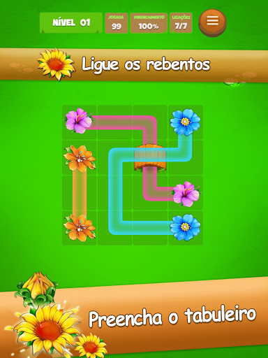 Ligue os rebentos iguais para os fazer florir. Preencha o tabuleiro para terminar o nível.