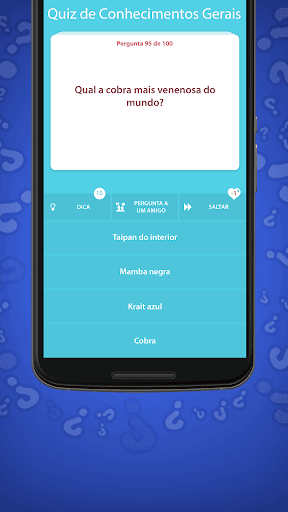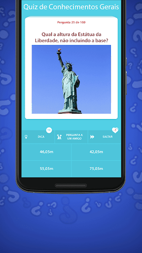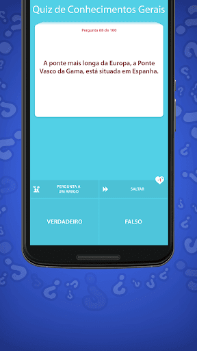 Quiz de Conhecimentos Gerais, um jogo de perguntas e respostas de conhecimentos gerais oferece mais de 150 perguntas de conhecimento geral em português, cada uma seguida de diversão fatos de conhecimentos gerais gratis sobre vários tópicos, desde história e geografia até música, cinema e esportes. Atualize seu conhecimento geral do mundo de graça e comece a aprender da maneira divertida! Não perca a chance de jogar o novo jogo de perguntas de conhecimento geral do mundo GRATUITAMENTE!