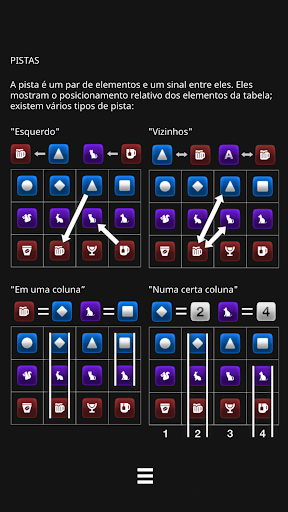 "Vizinhos" - indicado por uma seta de duas pontas, e significa que os elementos de pista estão nas colunas adjacentes da mesa de jogo, mas qual deles está à esquerda e qual à direita é desconhecido;