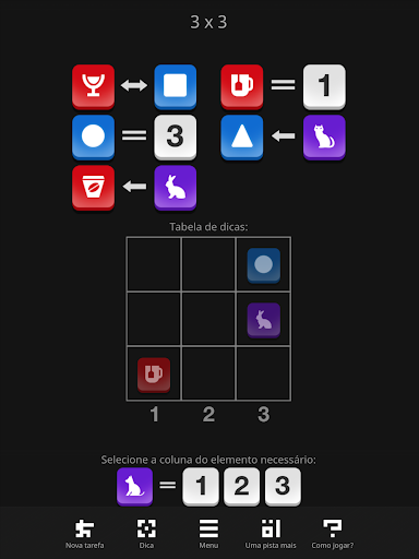 "Em uma coluna" é indicado por um sinal de igual e significa que os elementos de dicas estão estritamente em qualquer coluna da tabela do jogo;