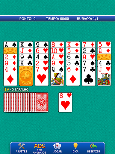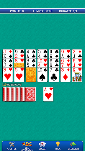 Golfe Paciência é um dos jogos de paciência mais jogados no mundo. O objetivo do jogo é concluir o campo de Golfe, consistindo em um, nove ou dezoito "buracos". Cada "buraco" é um quadro de 7 colunas, com 5 cartas distribuídas, todas viradas para cima. Uma carta adicional é distribuída como base da fundação. As 16 cartas restantes são viradas para baixo para formar o estoque e são suas "tacadas". Para vencer um buraco, você precisa limpar todas as cartas da mesa até a fundação, usando o menor número de tacadas possível, assim como num jogo de golfe de verdade. As cartas são jogadas em sequência, da menor para maior ou da maior para a menor, independentemente do naipe ou cor, não sendo necessário arrastar ou mover as pilhas de cartas. Jogue o quanto quiser, sem bloqueios nem restrições. Teste suas habilidades, faça a melhor pontuação, fique no topo do placar, obtenha conquistas e compartilhe os seus resultados com amigos. A Paciência Golfe é simples de aprender, mas difícil de dominar.