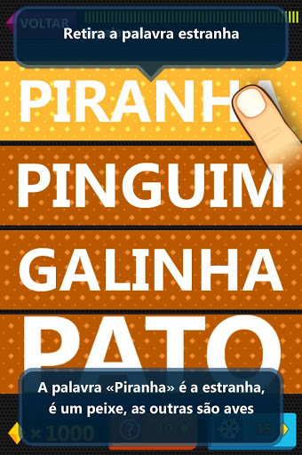 "Retira a palavra" é um jogo de palavras. O objetivo do jogo é encontrar e retirar a palavra que sobra. Por exemplo, "Piranha", "Pinguim", "Galinha", "Pato". A palavra "Piranha" sobra porque é um peixe, o resto são aves.