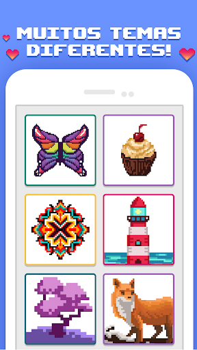 🎨DESCUBRA vários pacotes temáticos de imagens para pintar e tente colorir todas as ilustrações em pixel art! De um unicórnio mágico a uma paisagem exótica, não há nada que deus dotes artísticos não possam pintar!