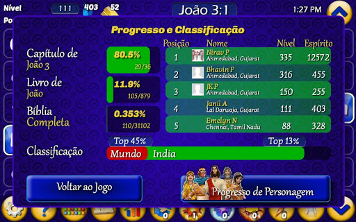 • Progresso da Personagem mostra-lhe o seu progresso enquanto aprende sobre os seus personagens favoritos em cada versículo