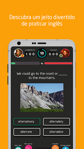 Quiz your English é uma versão divertida de jogos de perguntas para praticar, melhorar e testar seu inglês competindo contra alunos do mundo todo, no qual você aprende através de perguntas e respostas de inglês. Com esse jogo para treinar inglês, você consegue praticar diferentes exercícios de inglês com os amigos, construindo competências linguísticas vitais no processo, e testar-se em um ambiente verdadeiramente global.