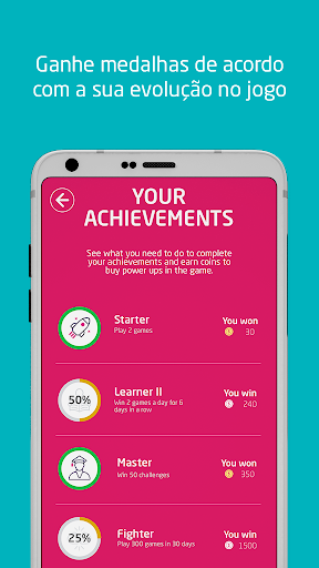 Os jogadores podem verificar suas estatísticas para ver onde eles erraram em cada quiz em inglês, e obter uma vingança (amigável!) com uma rápida revanche em um novo questionário em inglês. Ganhe pontos para subir no placar de líderes e ganhe moedas que podem ser trocadas por bônus nesse jogo para treinar inglês.