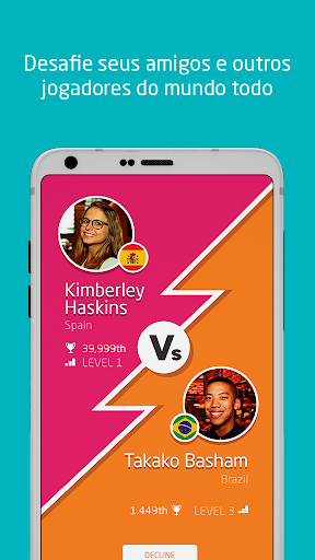 Enfrente suas habilidades de inglês desafiando outros jogadores e amigos através de jogos de perguntas. Convide amigos para jogar diversos quiz em inglês via Facebook ou procure um oponente pelo nome. Enfrente rivais internacionais em tempo real e lute para ver quem marca melhor tanto em exercícios de inglês geral como para o famoso IELTS test através de um desafiador teste de inglês. Esse é o jogo perfeito de perguntas e respostas de inglês, seja para quem adora um bom quiz em inglês.