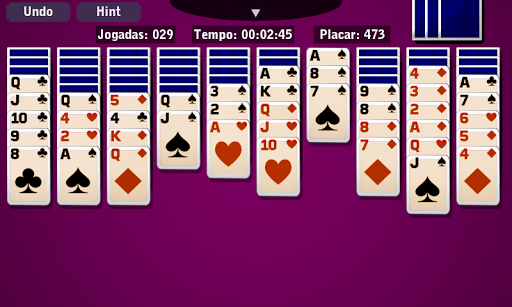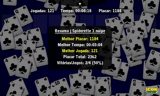 - 3 variação de jogo Spiderette: 1,2 ou 4 naipes