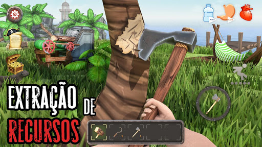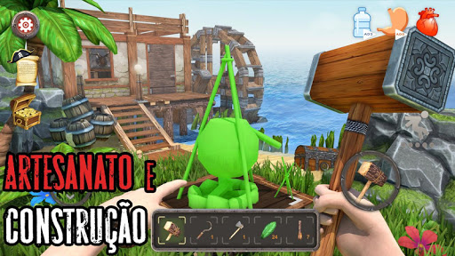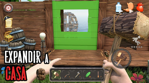 Use o gancho para obter os recursos necessários: detritos, folhas, barris e outros. Você precisará deles, porque nosso jogo de sobrevivência não permitirá que você fique entediado. Você será capaz de fazer um machado e cortar palmeiras, uma vara de pescar e peixe, lança e estocar comida.