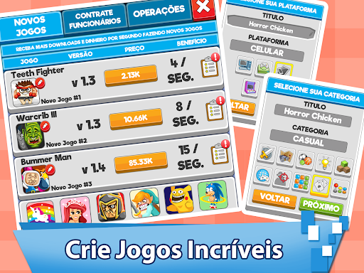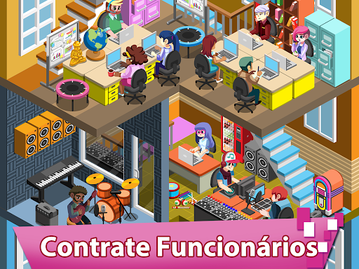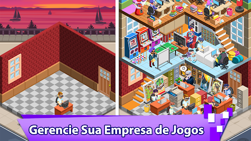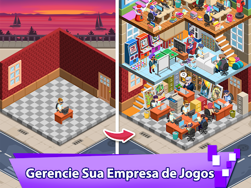 Torne-se o criador, Toque & Construa a sua própria empresa de games. Crie jogos, contrate funcionários, ganhe dinheiro, atualize e construa o seu estúdio de jogos! Tocar! Tocar! Clicar! Atualize & cresça – Planeje os seus investimentos financeiros e leve o seu estúdio para o próximo nível com atualizações de múltiplos andares. Crie um império do zero.