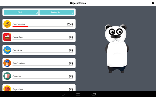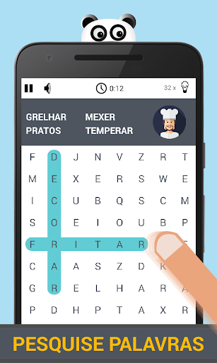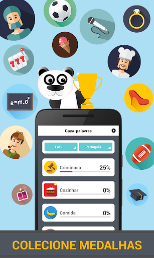 Caça Palavras Panda é aqui. Deslize todas as palavras ocultas e desbloqueie uma bela medalha em cada nível. Disponível em 7 idiomas: Inglês (Word Search Panda), Português (Caça palavras Panda),