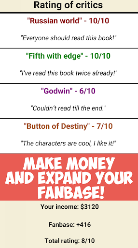 -Writing your own dream book: choose your genre, writing and form. Each book will be rated by top critics, from whose ratings your income depends.
