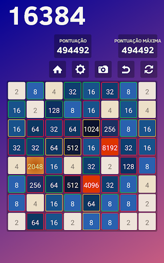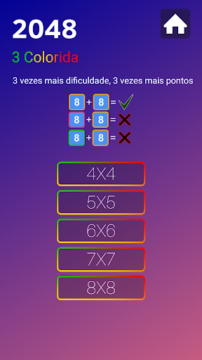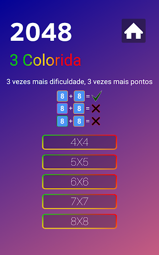 Existem 3 opções Coloridas, 2 Coloridas e Clássicas com cinco níveis de dificuldade, incluindo 4x4, 5x5, 6x6, 7x7 e 8x8 no 2048 Colorful.