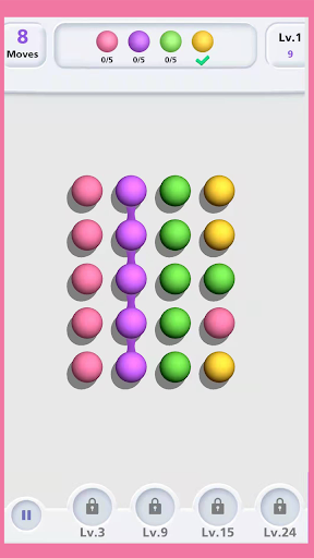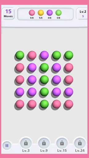 O jogo é simples e fácil de usar.Clique e arraste os dedos para conectar bolas adjacentes da mesma cor.Lembre-se de completar a meta dentro das etapas especificadas!