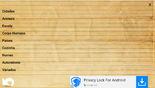 Este aplicativo é um jogo de forca completo com mais de 14000 palavras divididas em dez categorias diferentes. As categorias podem ser vistas abaixo: