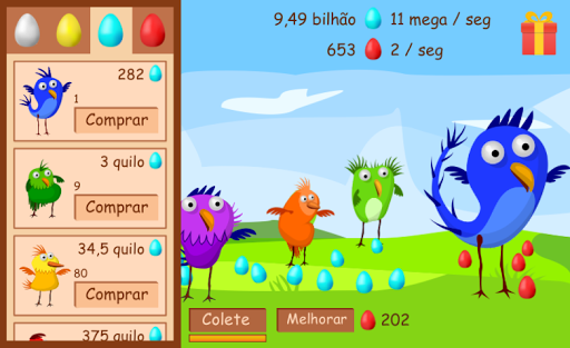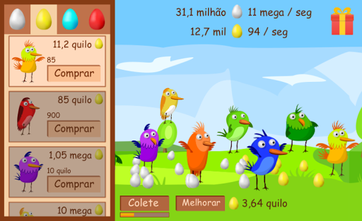 Cada pássaro carrega ovos brancos, dourados ou vermelhos ou azuis. O objetivo do jogo é comprar todos os pássaros.