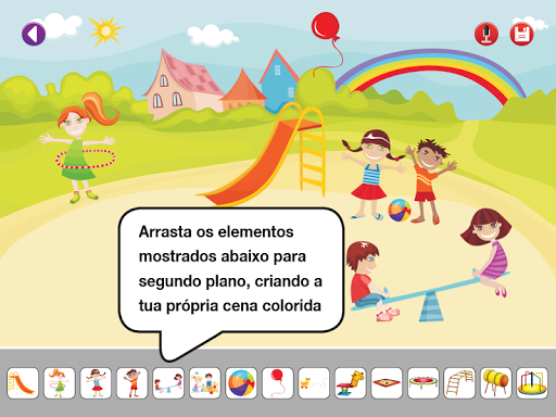 COMO JOGAR: Cada quadro apresenta um fundo para uma cena. Prime e arraste os elementos apresentados em baixo na imagem de fundo criando o seu próprio cenário colorido.