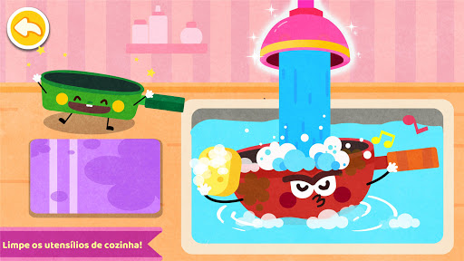 Os utensílios de cozinha estão sujos. Dê um banho neles. Coloque detergente na esponja. Esfregue suavemente os utensílios e as manchas vão desaparecer!