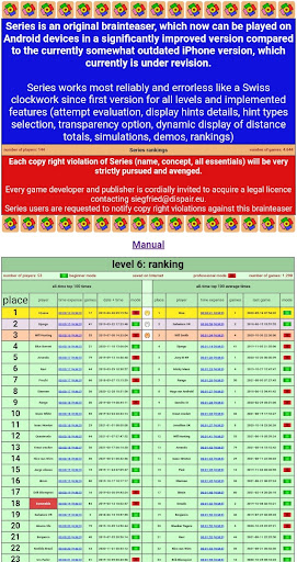 Esta versão de Series no Android oferece uma funcionalidade muito confortável (novo player e modo profissional, opção de transparência, seleção de informação, verifique os testes com antecedência, exibindo visualmente os resultados dos testes, exibição dinâmica da soma de todas as distâncias em relação à última tentativa, simulações, demonstrações e classificações) e, portanto, é particularmente adequada para crianças.