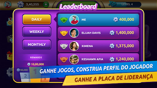 Nosso jogo também apresenta torneios diários, semanais e mensais para mantê-lo envolvido e permitir que você experimente um novo mundo de poker.