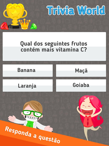 Escolha a resposta correta a partir de 4 possíveis. Todas as questões caem em 6 categorias: Entretenimento, Desporto, ciências, geografia, história e arte. A roda do Fortune escolhe a partir de qual categoria a questão será. Qual categoria é o seu favorito?