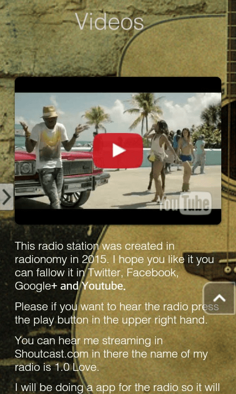 This radio station was created in radionomy in 2015. I hope you like it you can fallow it in Twitter, Facebook, Google+ and Youtube. This app gives a great experience for you and your community. You can have parties with it. Features: • Hear music. • Contact Us • Gallery. • News. • Videos. _____________________________________ You can request music, see the news, gallery, videos, chat and contact us through my web site down here. _____________________________________ Web Site: http://wilmer20.wix.com/1-0love Twitter: https://twitter.com/WilmerRodrigu39 Facebook: https://www.facebook.com/sation1.0 Google+: https://plus.google.com/u/0/b/108088737259550700942/108088737259550700942/posts Youtube: https://www.youtube.com/channel/UCvfphIJk588juz1sCa7Bc3g _____________________________________ This app is legal in all the countries and was made by ©2015 by Wilmer Rodriguez.
