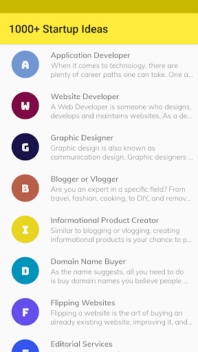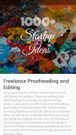 1000 Startup Ideas as name suggests is an innovative platform for existing and aspiring entrepreneurs. Want to start your own business? This app is compilation of business ideas for an entrepreneur to seek, effectively develop, and validate a scalable new businesses. Many entrepreneurs seek new businesses that intend to grow beyond the solo founder, have employees, and intend to grow large but don't know how to begin. For those entrepreneurs this app will be very helpful.