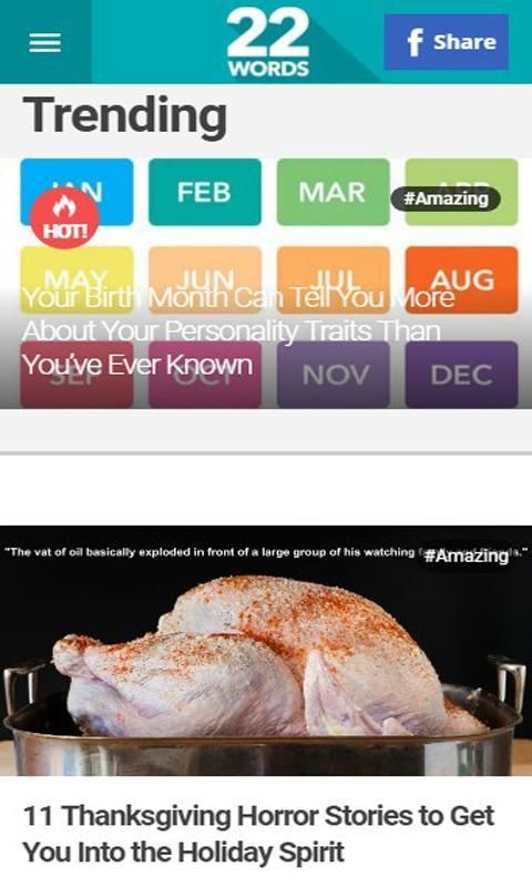 22 Слова собирают смесь всего от серьезного и творческого к глупым и абсурдным. Как ваш источник для сумасшедшей, любопытной, и комической стороны полотна, 22 Слова можно рассчитывать на то, поделиться забавным и увлекательным вирусный контентом, а также более неясных (но не менее интересные) фотографиями, видео и многими другими.