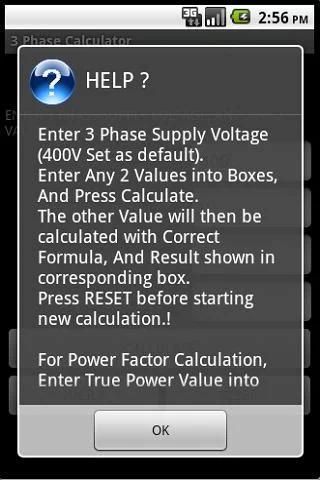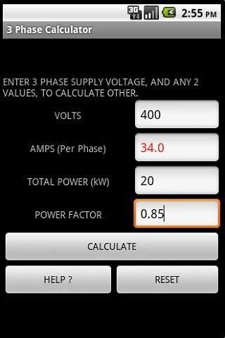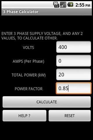 ELECTRICAL 3 PHASE POWER CALCULATOR A useful application for any electrician / engineer. Calculates Power (kW), Current (A) and Power Factor from any 2 given values for 3ph circuits. Quick and easy to use. Simply Enter supply voltage (400V Default Setting) Then Enter any 2 values of either Total Power Rating, Current per phase or Power Factor to Calculate other value. Results Assume a balanced Load. Please rate this App if you like it. More great Electrical Apps available from COOPERSOFT. All BS 7671:2008 Amd 1 Compliant. At COOPERSOFT we specialise in developing engineering applications for android devices. If you have an idea for an App that you would like to see on Google Play, then please contact us. If you have any comments or would like any extra features added to application then please feel free to contact us. KEYWORDS : Power, Watts, Volt, Voltage, Resistance, Ohms, Ohms law, impedance, kilowatts, electrical, electrician, BS 7671, Cable, Current, Rating, 17th Edition,