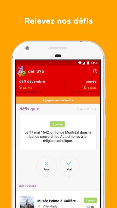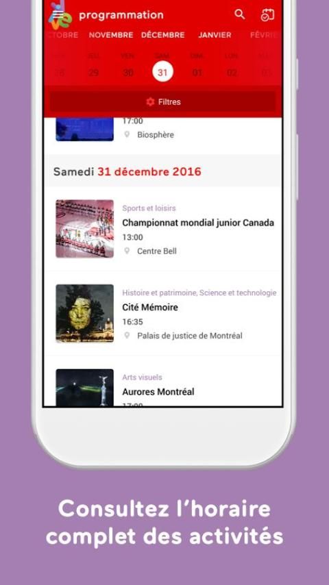 - Быстро найти сотни мероприятий по программированию 375-летия Монреаля по категориям: изобразительное искусство, история и наследие, спорт, музыка и т.д.