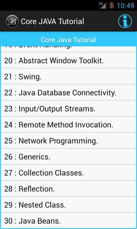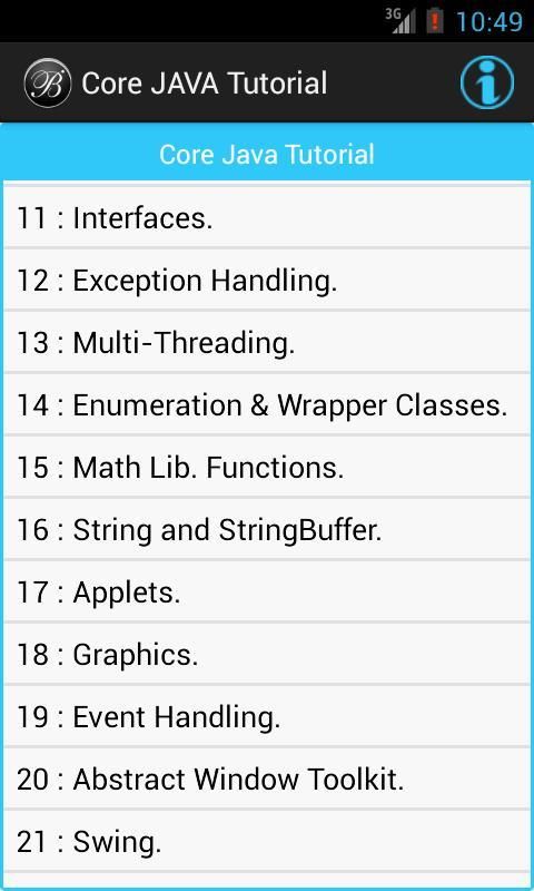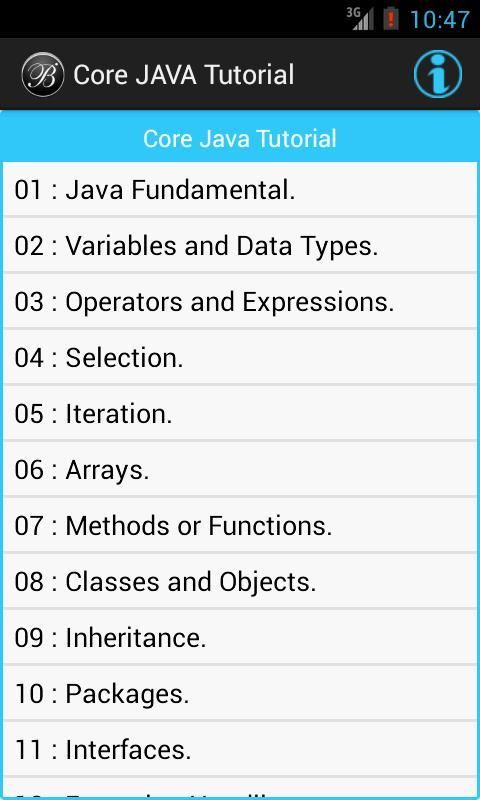 This Core JAVA Tutorial App will help you to learn JAVA programming language by simple example. This Core JAVA Tutorial App is very useful for all type of learners. We designed this Core JAVA Tutorial App in a plain simple way in order that it is easily understandable by everyone. This Core JAVA Tutorial App is good for beginners to learn basic JAVA programming by simple and suitable examples.