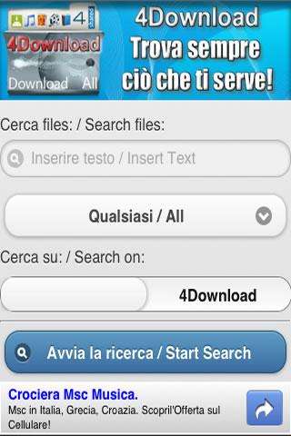 4Download l39;unica app che ti permette di scaricare file, musica, video e tanto altro dai portali: 4Shared, Mediafire, Rapidshare, ecc...Visita il canale Twitter di LiberoLabs: http:twitter.comLabsLibero Questa App un39;interfaccia per i siti di ricerca web: MediaFire, RapidShare, 4Shared, 4Shared Music, 4Shared Video, 4Shared Books, 4Shared photo L39;App ottimizzata per dispositivi mobile e si basa sulle norme rispettate dai siti a cui si interfaccia. L39;App NON salva i dati digitati, quali password, username, ecc... Eventuali problemi o malfunzionamenti di link, tasti o script, sono da imputare alle pagine web visualizzate e in alcun modo all39;App, poich quest39;ultima NON effettua nessuna modifica ai siti web. Lo sviluppatore, il Publisher e l39;Editor non sono associati ai proprietari dei servizi offerti dalle pagine web.4Shared, 4Download, 4Download 4Shared, shared, rapidshare, mediafire, download best, 4 download, file,