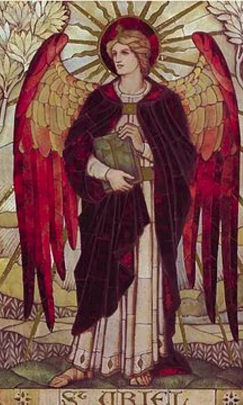 Уриэль также Ауриэль / Oriel (Бог мой свет). Уриэль появляется во второй книге Ездры, в которой пророк Эзра просит Бога ряд вопросов, и Уриэль послан Богом, чтобы дать ему поручение. В христианских Евангелиях Уриэль апокрифических играет роль, различающихся между источниками, в спасении двоюродный брат Иисуса Иоанна Крестителя из Избиение младенцев по заказу царя Ирода. Он несет Джон и его мать Сент-Элизабет, чтобы присоединиться к Святое семейство после того, как их пути в Египет. Уриэль часто отождествляют как херувим и ангел покаяния. Он "стоит у ворот Эдема с огненным мечом", или, как ангел, который "следит за громом и террора". В Апокалипсис Петра он предстает как Ангел Покаяния, который графически изображается как, как безжалостный, как и любой демон. В жизни Адама и Евы, Уриэль рассматривается как дух (то есть, один из херувимов) третьей главе Бытия. Он также определен как один из ангелов, которые помогли похоронить Адама и Авеля в раю. Он проверил двери Египта за кровь ягненка во время чумы. Кроме того, он держит ключ к Ямы в конце времен и привело Авраама к Западу. В современном ангелологии, Уриэль определяется по-разному как серафим, херувим, регент солнца, пламенем Бога, ангел Божественного Присутствия, предстоятелем над Тартар (ад), Архангела спасения, и, в более поздних писаниях, отождествляется с Фануилова " лицо Бога ". Он часто изображается проведения книгу или свиток папируса, представляющий мудрость. Уриэль является покровителем искусств.
