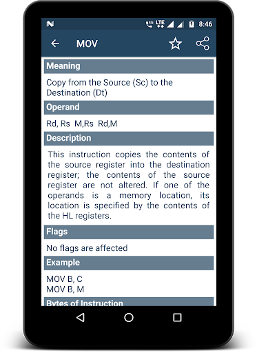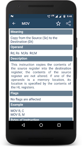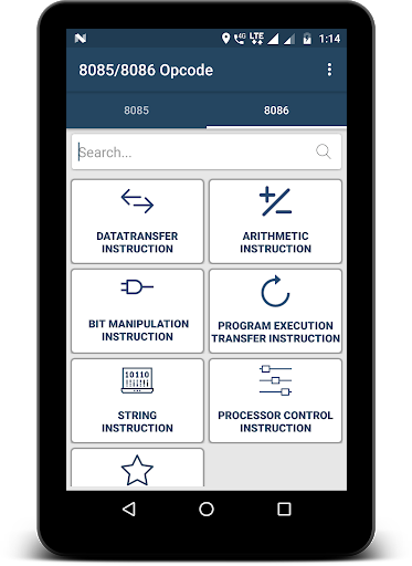8085/86 Opcodes is an app containing all the instruction set or opcodes of 8085 and 8086 microprocessor. Here opcode detail contains information like meaning of Opcode, Operand (16-bit address or more), brief description of opcode, flags affected while using the opcode, example showing how to use opcode, bytes required to use the instruction/opcode, machine cycle (m-cycle) and t-state require to use the instruction/opcode. Referring to assembly instructions was never so easy before.