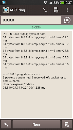 Приложение для проверки соединений в сетях на основе TCP/IP. Приложение отправляет запросы протокола ICMP указанному узлу сети и фиксирует поступающие ответы. Время между отправкой запроса и получением ответа позволяет определять двусторонние задержки по маршруту и частоту потери пакетов, то есть косвенно определять загруженность на каналах передачи данных и промежуточных устройствах. Приложение поддерживает 3G и Wi-Fi, но к сожалению, не все операторы сотовой связи разрешают пинг через свои сети.