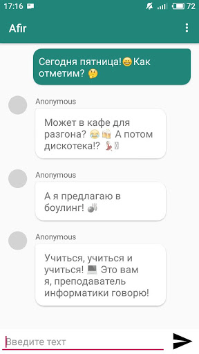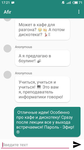 В отличие от других подобных чатов AFIR работает даже там, где нет доступа в сеть интернет и где не работает геолокация!