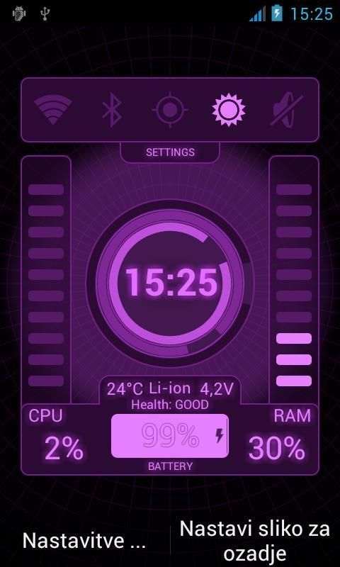 Все-в-одном Wallpaper живые обои, которая заменяет необходимость в дополнительных виджетов. Он отображает текущее время, дату, информацию батареи, процессора и использование оперативной памяти, информацию об объеме памяти и предоставляет возможность включить или отключить Wi-Fi, Bluetooth, GPS, Без звука, режим вибрации и установить яркость экрана. Изменение цвета и настроить его под свои нужды.