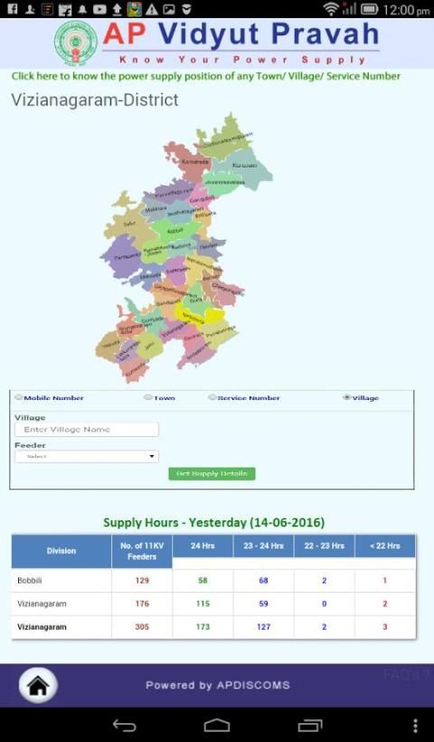 Дружественный пользовательский интерфейс, основанный на географической карте Андхра-Прадеш, облегчает всех потребителей / заинтересованных сторон в визуализации наличия питания и питания позиции питания на DISCOM / Район / Город / уровень Подключение Village / Service.