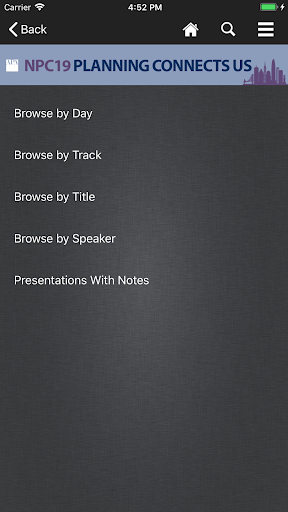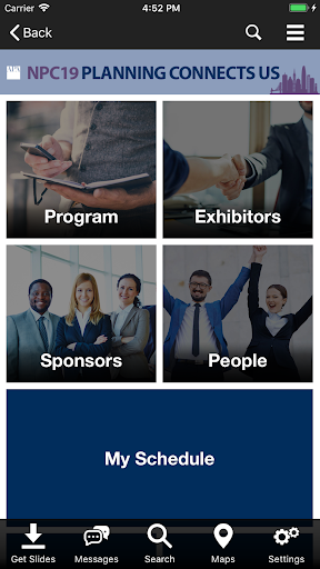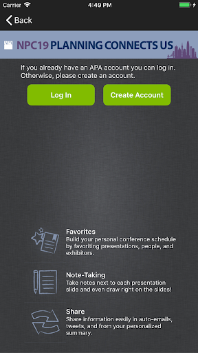 NPC19 event. Users can take notes adjacent available presentation slides and draw directly on slides inside the app. Note-taking is also available in the exhibitor module.