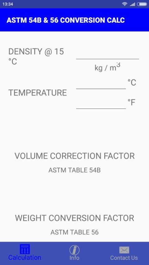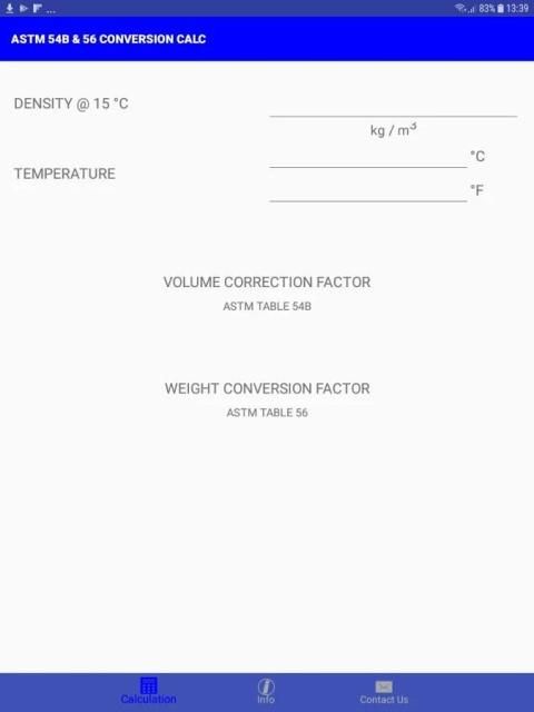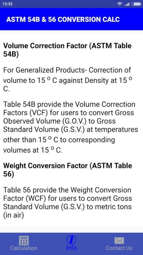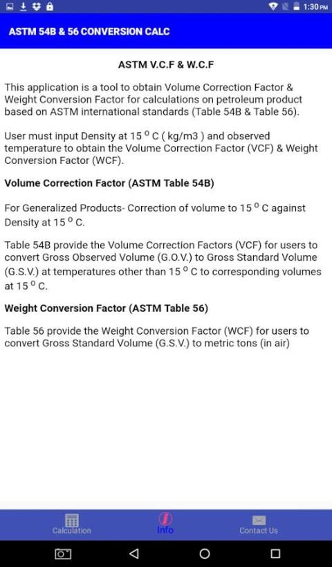 Это приложение является инструментом для получения Volume Correction Factor & Коэффициента преобразования веса для расчетов по нефтепродукту на основе международных стандартов ASTM (таблица 5 и таблица 56).