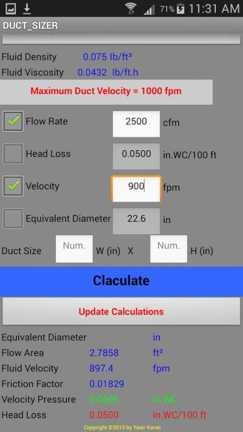 КАНАЛ SIZER: Вы можете проверить MAX скорость в простой и быстрый способ .by ввести два входа можно получить всю информацию, необходимые для выполнения воздуховода конструкции можете ИСПОЛЬЗОВАТЬ описание как использовать это приложение. Пресс О кнопку, то описание use.You МОЖЕТЕ ИЗМЕНИТЬ между любыми двумя переменными (РАСХОДОМ, скорость, руководитель потери и эквивалентный диаметр), чтобы получить others.if ВЫ ЛЮБИТЕ изменения высоты воздуховода ВЫ сможете увидеть напорные ПОТЕРЯ и скорость изменений путем ПРЕСС-ОБНОВЛЕНИЕ РАСЧЕТ КНОПКА.