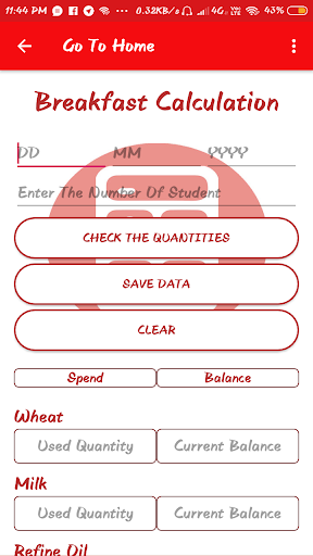 Here user can calculate the goods details by entering only number of student present in that day. User can calculate how many quantities are used to make their food and they can also get the details about the stock of goods(that is always decrease day by day).