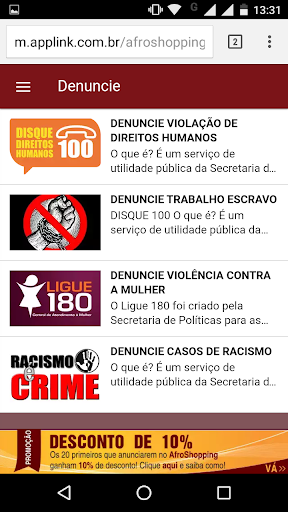 • Denúncias (violação dos direitos humanos, racismo, homofobia, violência contra a mulher, trabalho escravo)