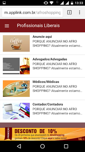 O Afro Shopping oferece por um preço acessível serviços de publicidade no App. Através do aplicativo você pode oferecer produtos e serviços, divulgar eventos, realizar parcerias e informar aos seus clientes, amigos e parceiros sobre promoções e novos lançamentos.
