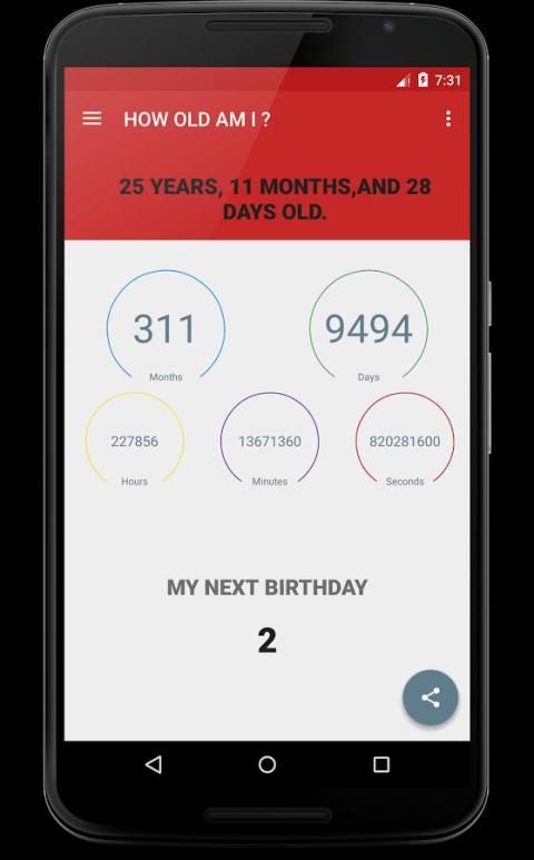 Знай своего возраста. Рассчитайте свой возраст в днях, лет, минут, секунд. Просто знаю, сколько дней / часов / минут были прошло с тех пор время Вашего рождения. Подсчитайте, сколько дней осталось для вашего следующего дня рождения.