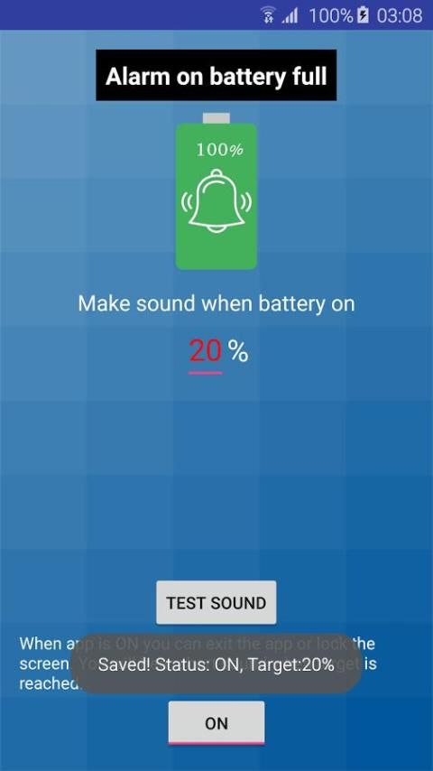 С тревогой на батарее полного вы можете ввести свой собственный процент, когда телефон заряжается вы можете расслабиться - мы расскажем вам, с хорошим звуком, когда она достигнет цели!