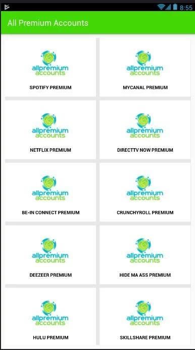 Все Счета Премиум приложение, которое содержит и предоставляет вам все премиум-аккаунтов для приложений / сайтов бесплатно. Вы также можете получить доступ к веб-сайты / получить приложения из приложения. Вы можете найти и открыть ссылки в приложении.