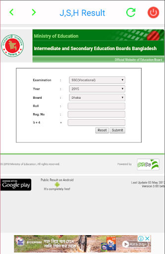 this app is made for learning all result of Bangladesh like PSC, JSC, SSC, HSC, DIPLOMA, HONOURS, MASTERS, DEGREE, MBBS, BDS, BCPS, NTRCA.